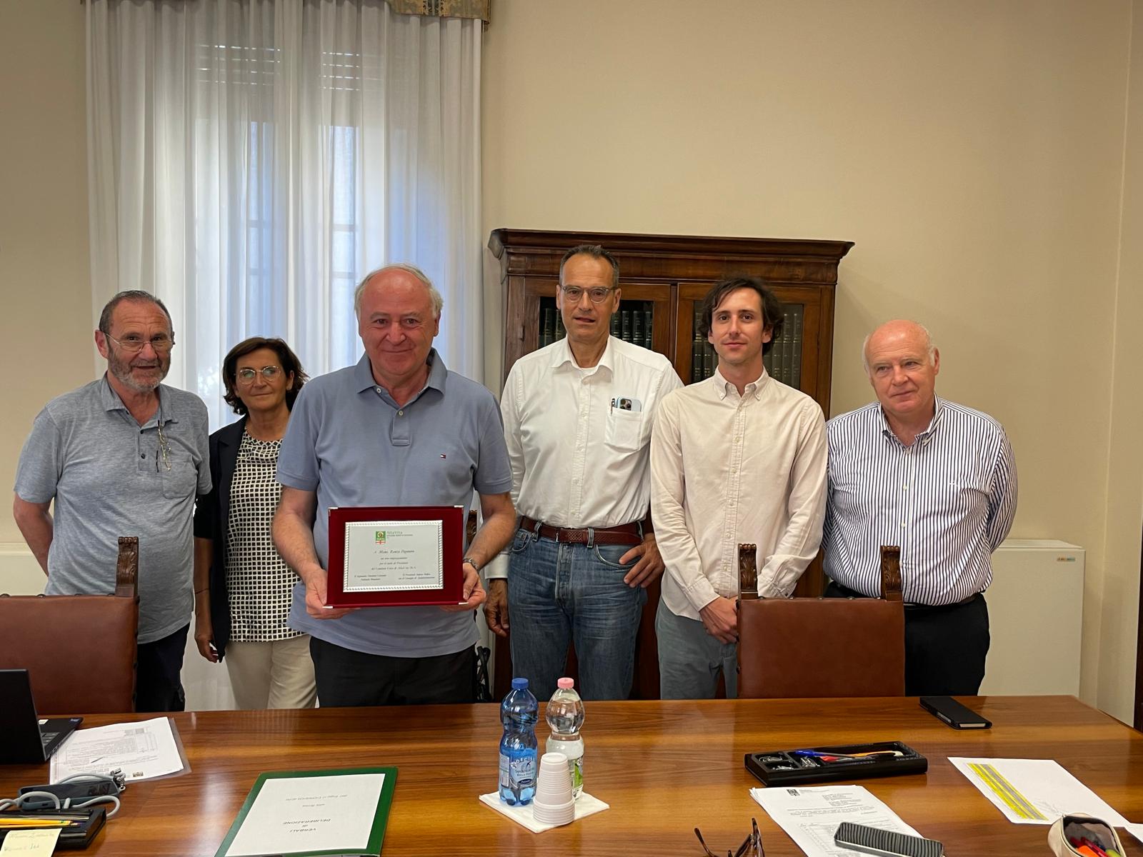 GLI VIENE CONSEGNATA UNA TARGA PER RINGRAZIARLO DEL LAVORO SVOLTO ALLA PRESIDENZA DEL COMITATO ETICO DA PARTE DEL CDA DI ALTAVITA-IRA. A DESTRA DI PEGORARO IL PRESIDENTE STEFANO BELLON