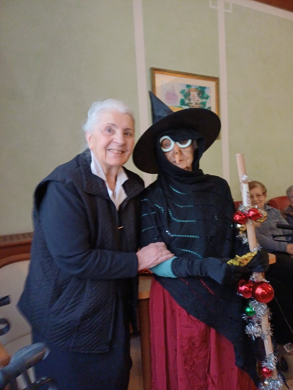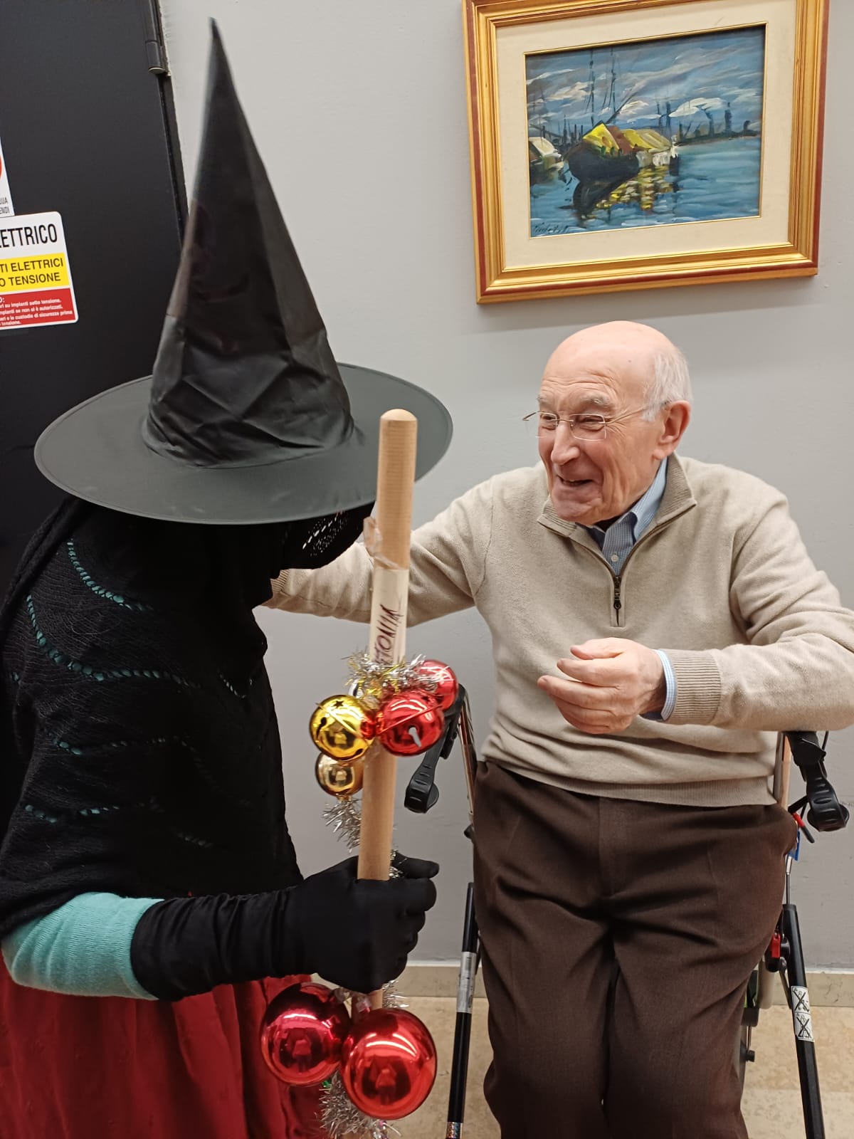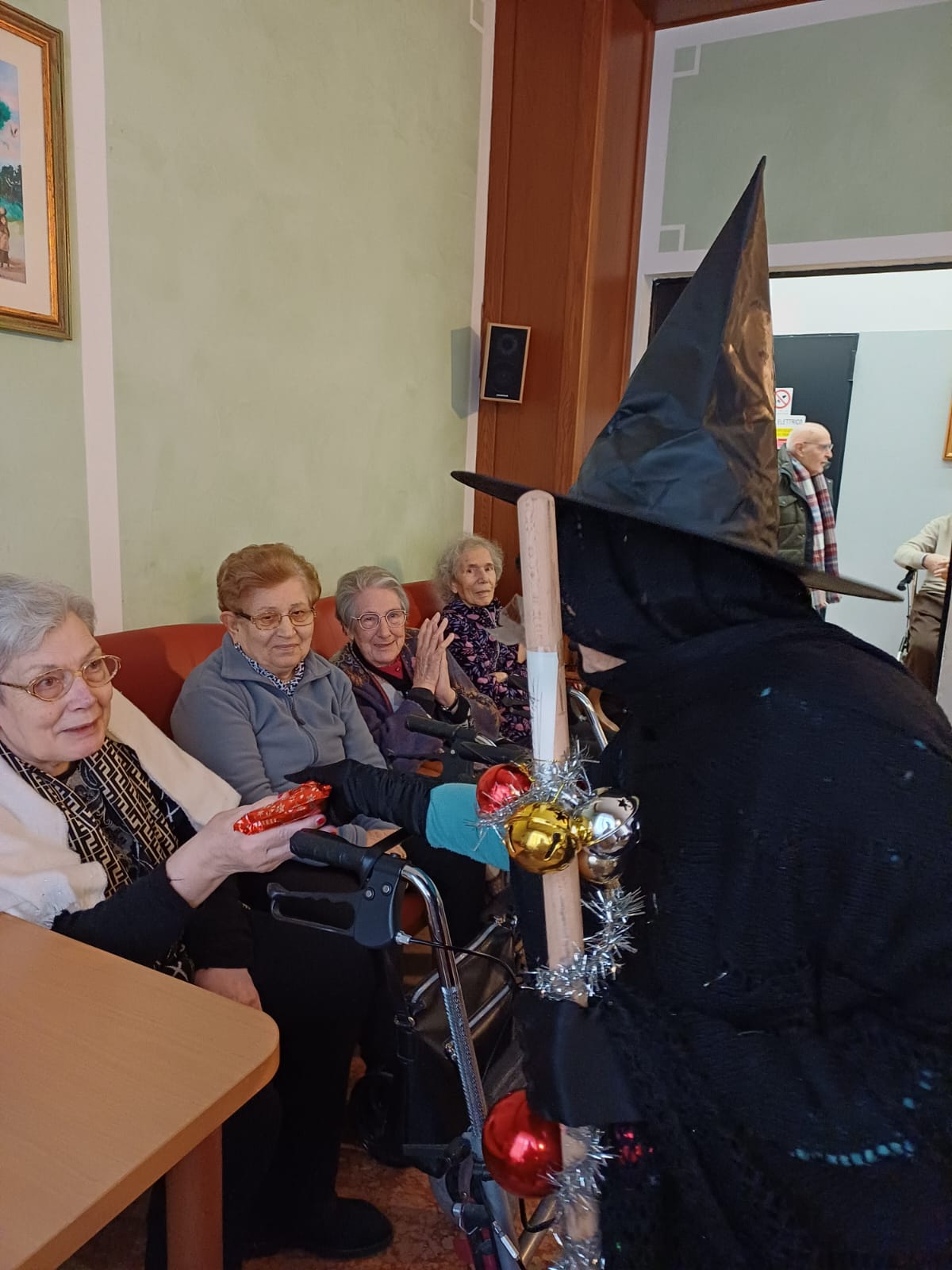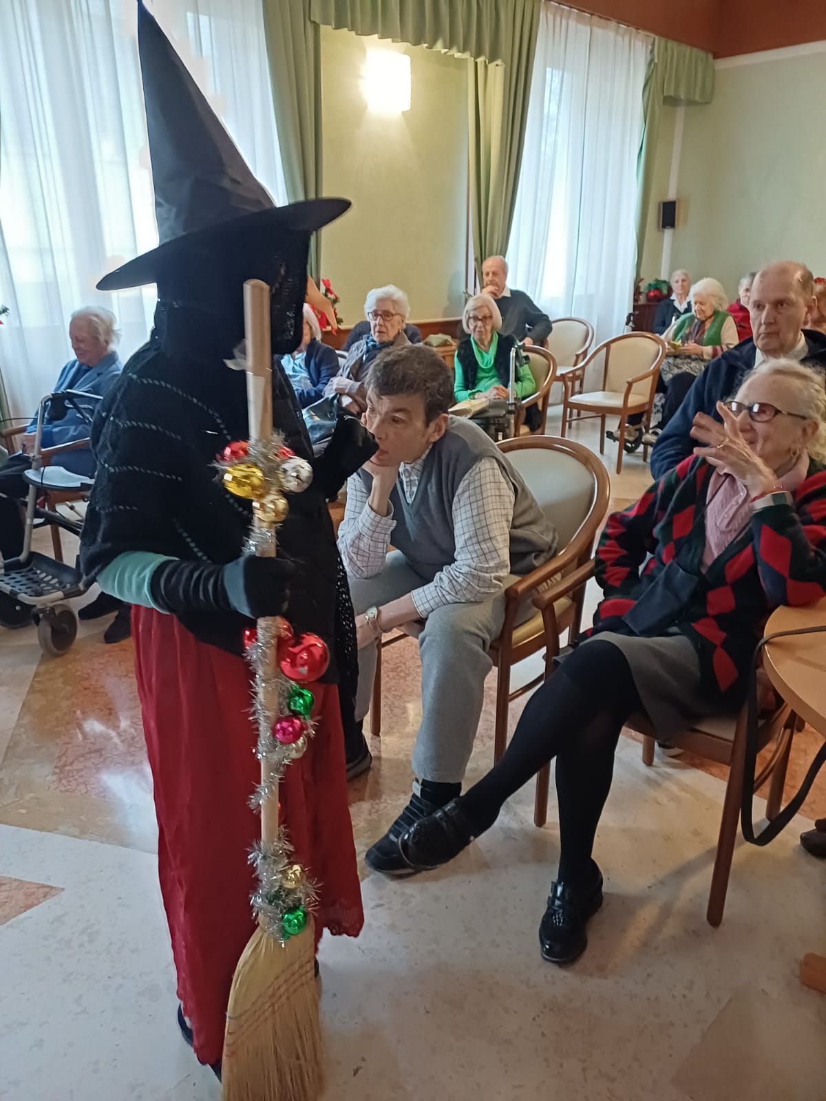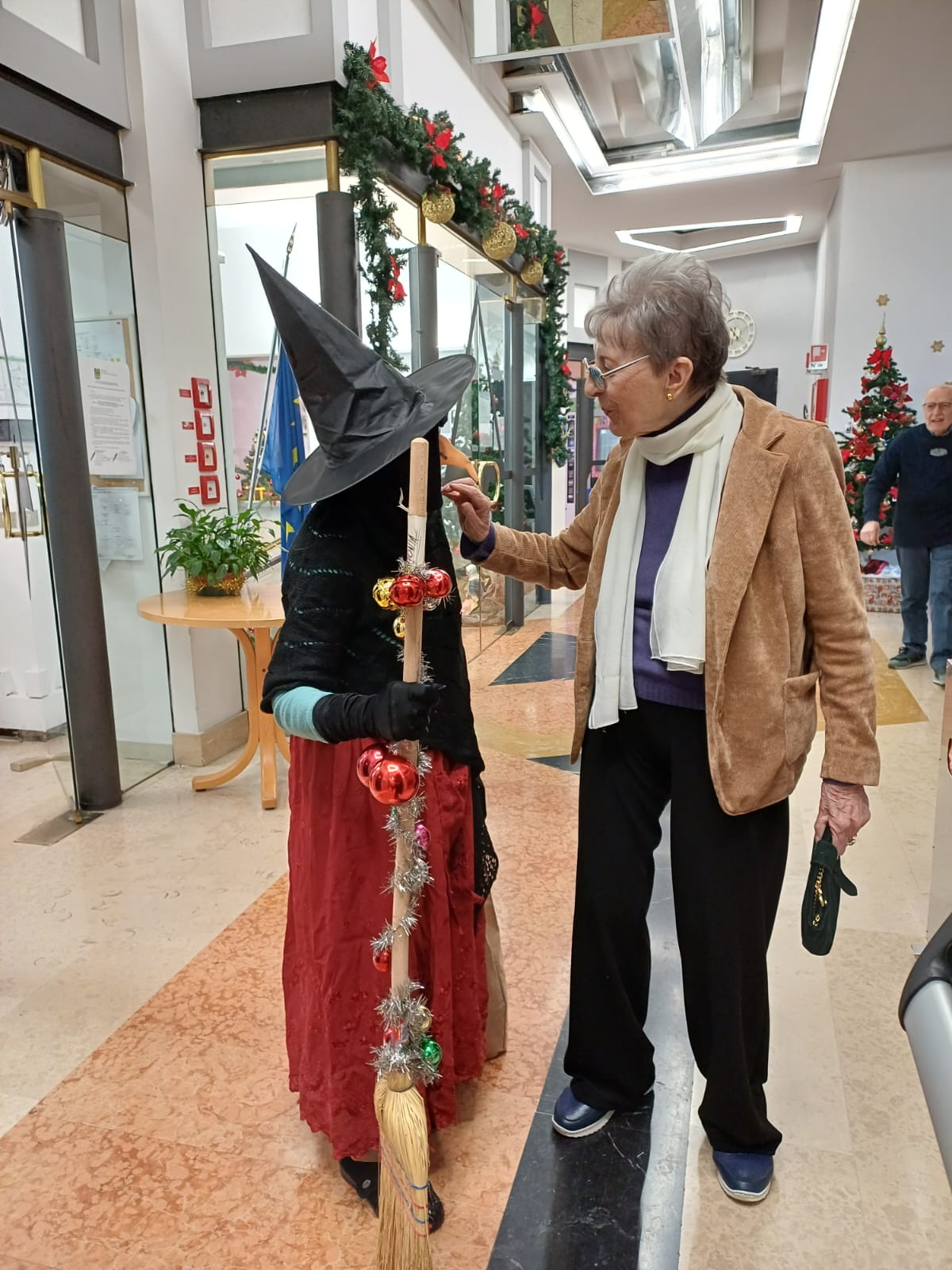 Il 5 gennaio il Pensionato Piaggi di AltaVita-IRA ha chiuso in bellezza le festività natalizie con un’Epifania decisamente… sui generis. Una Befana in grande spolvero si è aggirata per corridoi e sale comuni con tanto di cappellaccio a punta, occhialoni bianchi che facevano concorrenza alla luna piena, gonna rossa svolazzante e una scopa decorata con palline colorate degna di un albero di Natale ambulante.