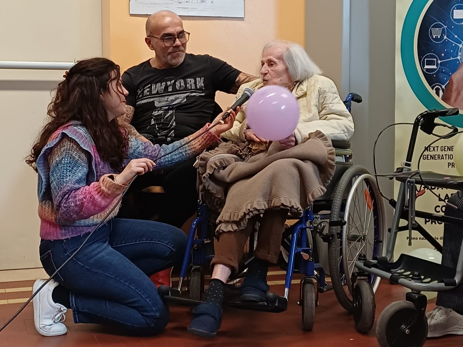Gli ospiti hanno preso il microfono e hanno risposto con la forza dell’esperienza vissuta. Le immagini mostrano momenti toccanti: una signora anziana che parla al microfono tenuto da un’educatrice, un’altra che racconta con gli occhi bassi, concentrata, mentre accanto a lei un anziano signore ascolta in silenzio. Parole vere. Vissute. Non teoriche.
