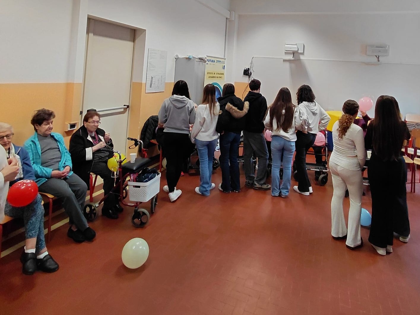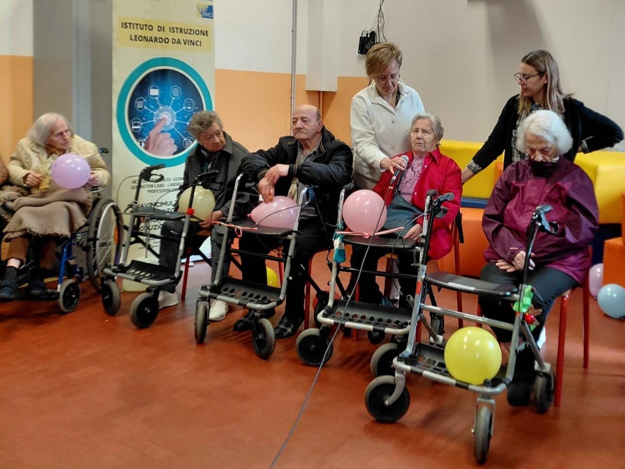 C’è una foto che racconta tutto. Un gruppo di persone nell’atrio luminoso dell’I.I.S. Leonardo da Vinci di Padova: davanti, seduti su sedie e carrozzine, undici anziani ospiti del Centro Servizi Beato Pellegrino. Dietro, in piedi, educatrici e operatori di AltaVita-IRA. Ai lati, i banner blu della scuola. Tutti sorridono.