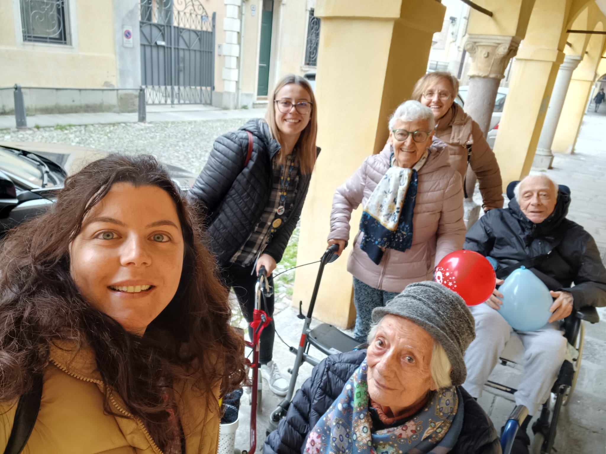 Al termine dell’incontro, i ragazzi avevano preparato un pensiero per i loro ospiti: palloncini colorati, che gli anziani si sono portati via con sé. La selfie scattata sotto i portici al rientro — palloncini rossi e azzurri in mano, sorrisi larghi — è forse l’immagine più bella dell’intera mattinata.