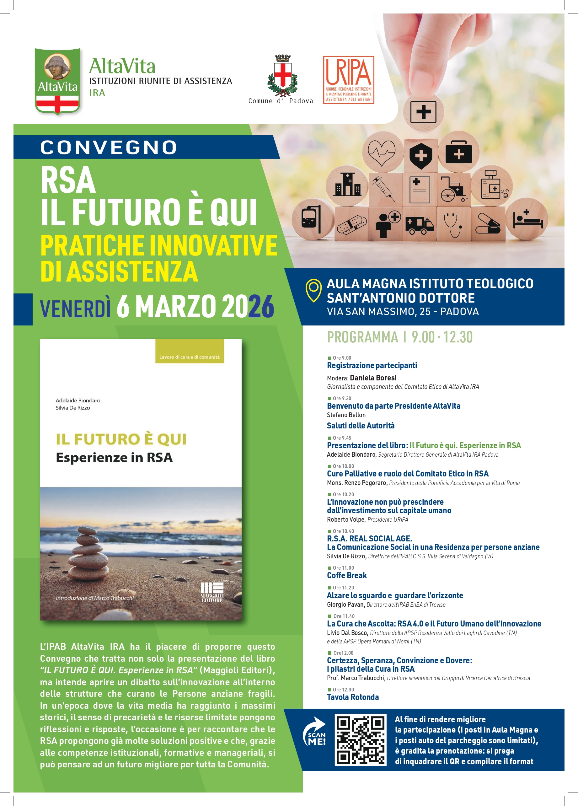 Venerdì 6 marzo 2026, dalle ore 9.00 alle 13.30 circa, l’Aula Magna dell’Istituto Teologico Sant’Antonio Dottore di Padova (Via San Massimo, 25) ospiterà il convegno “RSA IL FUTURO È QUI – Pratiche innovative di assistenza”, organizzato da AltaVita-IRA con il patrocinio del Comune di Padova e di URIPA.